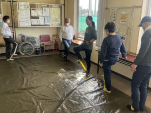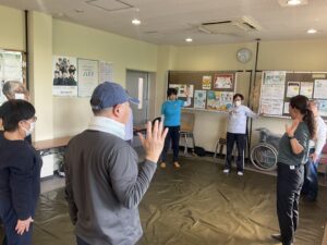 歩く前に、室内でケアストレッチを行いました。